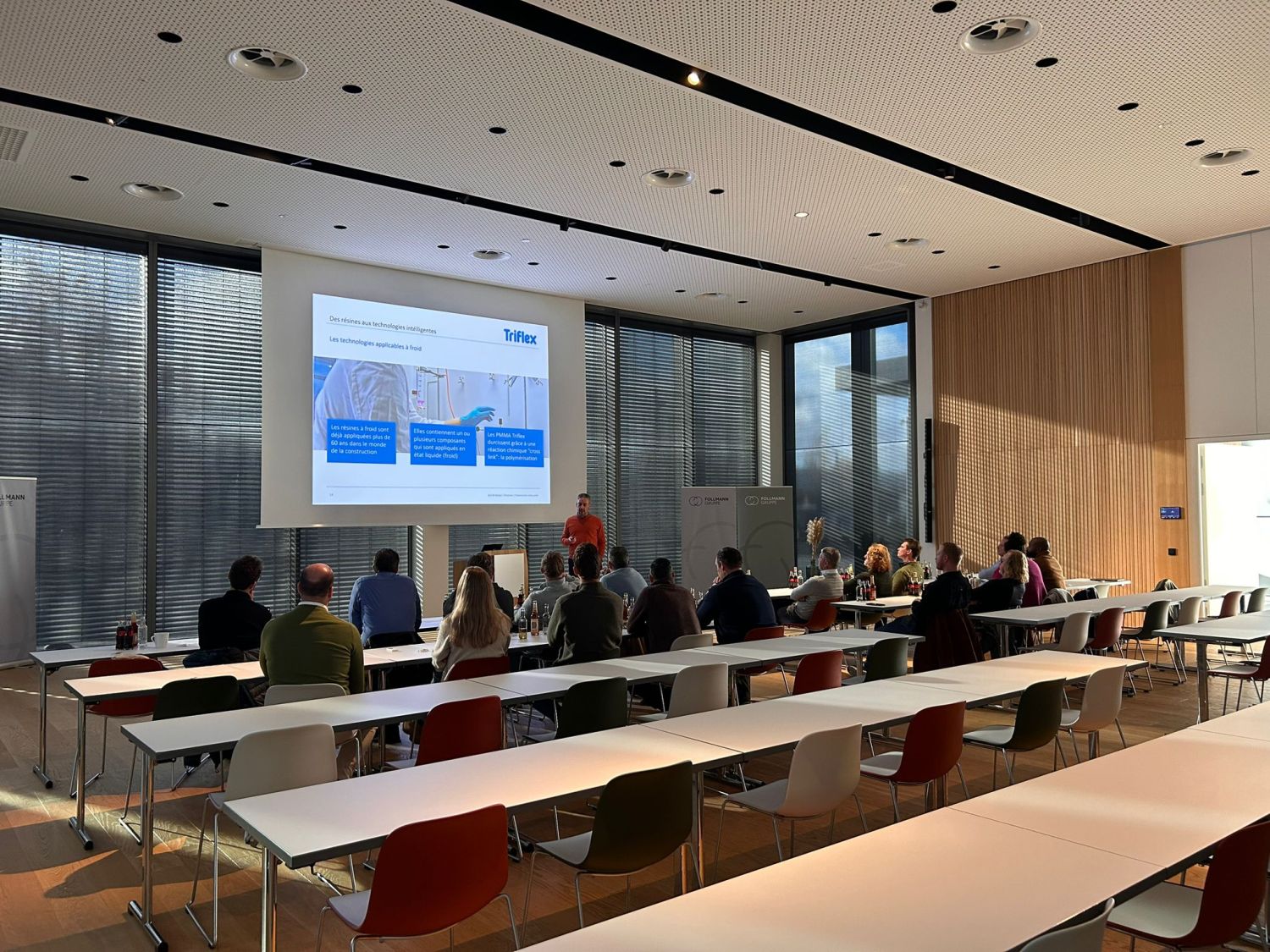 La visite du centre d’innovation et du laboratoire d’essai a offert un aperçu exclusif du processus de R&D rigoureux que suit chaque produit Triflex. La résistance au feu élevée, la conformité aux normes européennes telles que l’ETAG 005 ainsi que la préparation minutieuse des supports ont été largement abordées.