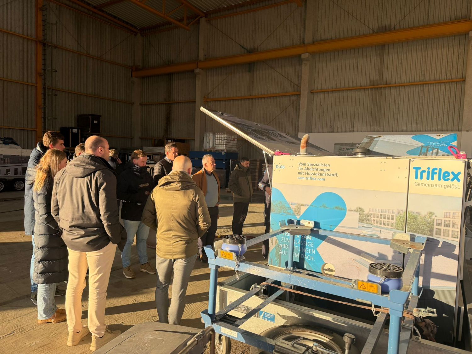 Le programme de l’après-midi a mis en lumière plusieurs thématiques techniques et innovantes. Les participants ont assisté à des démonstrations sur l’étanchéité des détails classiques avec Triflex ProDetail, des systèmes de dosage, de nouvelles techniques robotiques pour les toitures ainsi que des applications par pulvérisation via notre Triflex SAM. Les visiteurs ont également eu l’occasion de tester eux-mêmes la facilité d’utilisation de notre Triflex SAM, une expérience qui a été très bien accueillie.